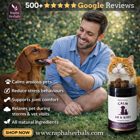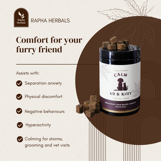 Calm K9 & Kitty is a remedy for pets exhibiting anxiety or responding to stress. Rapha Herbals signature blend is H*mp plus botannical mood enhancer and other renowned calming herbals to assist with reducing anxiety and stress in your pet.