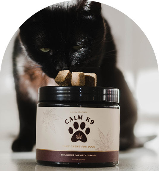 Calm K9 & Kitty is a herbal remedy for Pets exhibiting anxiety or responding to stress. Our Hemp plus serotonin chews help with:
